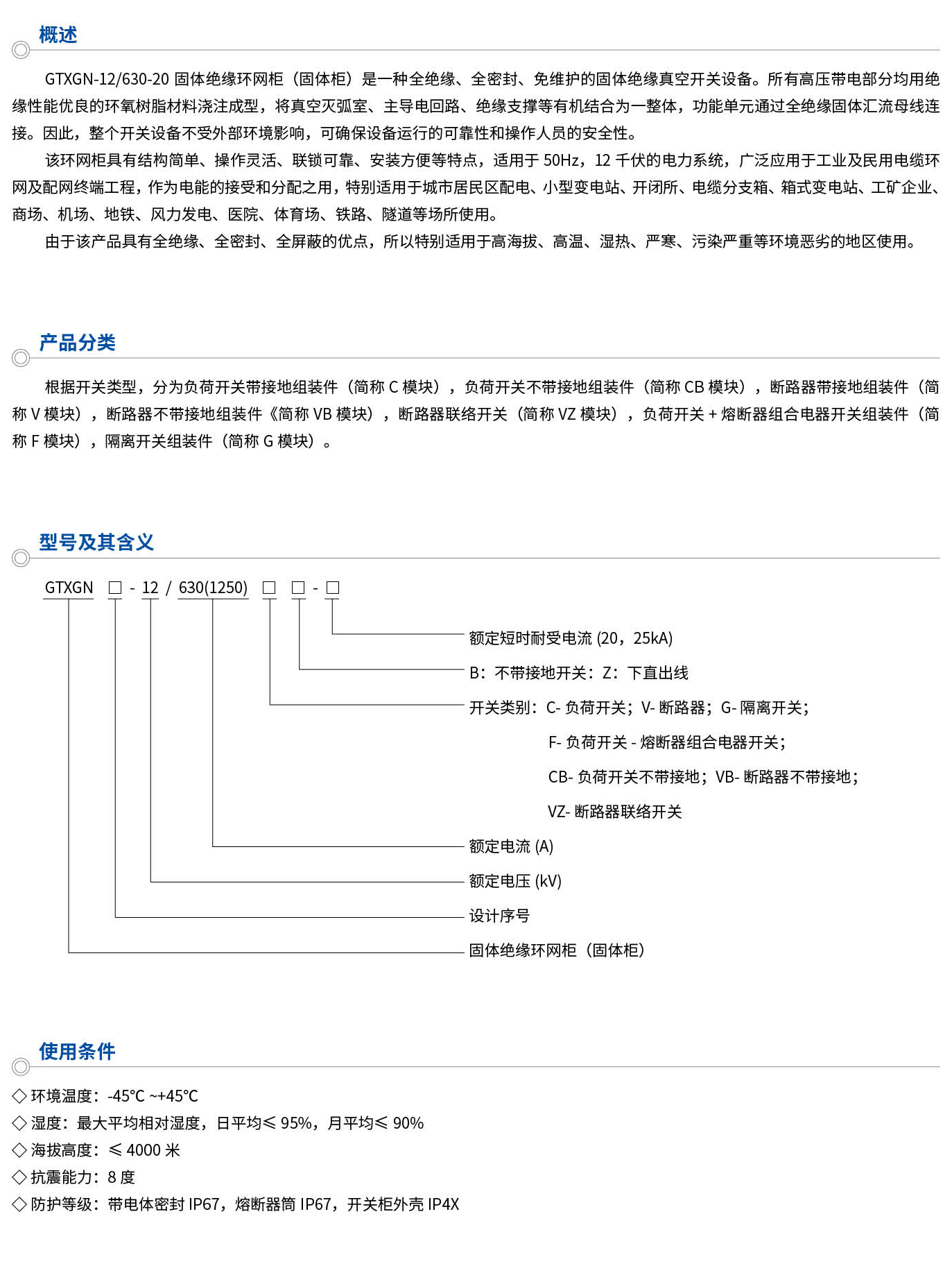 GTXGN-12/630-20固体绝缘环网柜(固体柜)是一种全绝缘、全密封、免维护的固体绝缘真空开关设备。所有高压带电部分均用绝缘性能优良的环氧树脂材料浇注成型,将真空灭弧室、主导电回路、绝缘支撑等有机结合为一整体,功能单元通过全绝缘固体汇流母线连接。因此,整个开关设备不受外部环境影响,可确保设备运行的可靠性和操作人员的安全性。该环网柜具有结构简单、操作灵话、联锁可靠、安装方便等特点,适用于50Hz,12千伏的电力系统,广泛应用于工业及民用电缆环网及配网终端工程,作为电能的接受和分配之用,特别适用于城市居民区配电、小型变电站、开闭所、电缆分支箱、箱式变电站、工矿企业、商场、机场、地铁、风力发电、医院、体育场、铁路、隧道等场所使用。由于该产品具有全绝缘、全密封、全屏蔽的优点,所以特别适用···