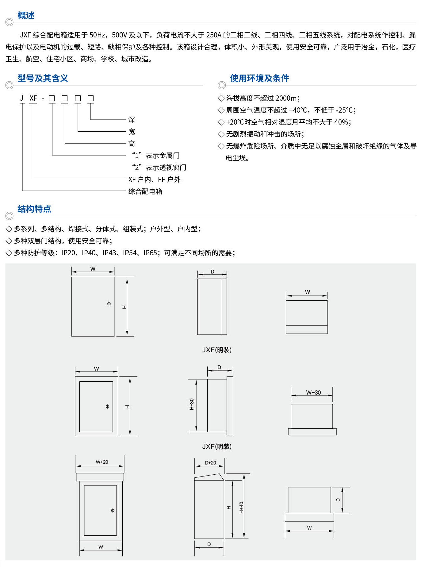 JXF综合配电箱适用于50Hz,500V及以下,负荷电流不大于250A的三相三线、三相四线、三相五线系统,对配电系统作控制、漏电保护以及电动机的过载、短路、缺相保护及各种控制。该箱设计合理,体积小、外形美观,使用安全可靠,广泛用于治金,石化,医疗卫生、航空、住宅小区、商场、学校、城市改造。