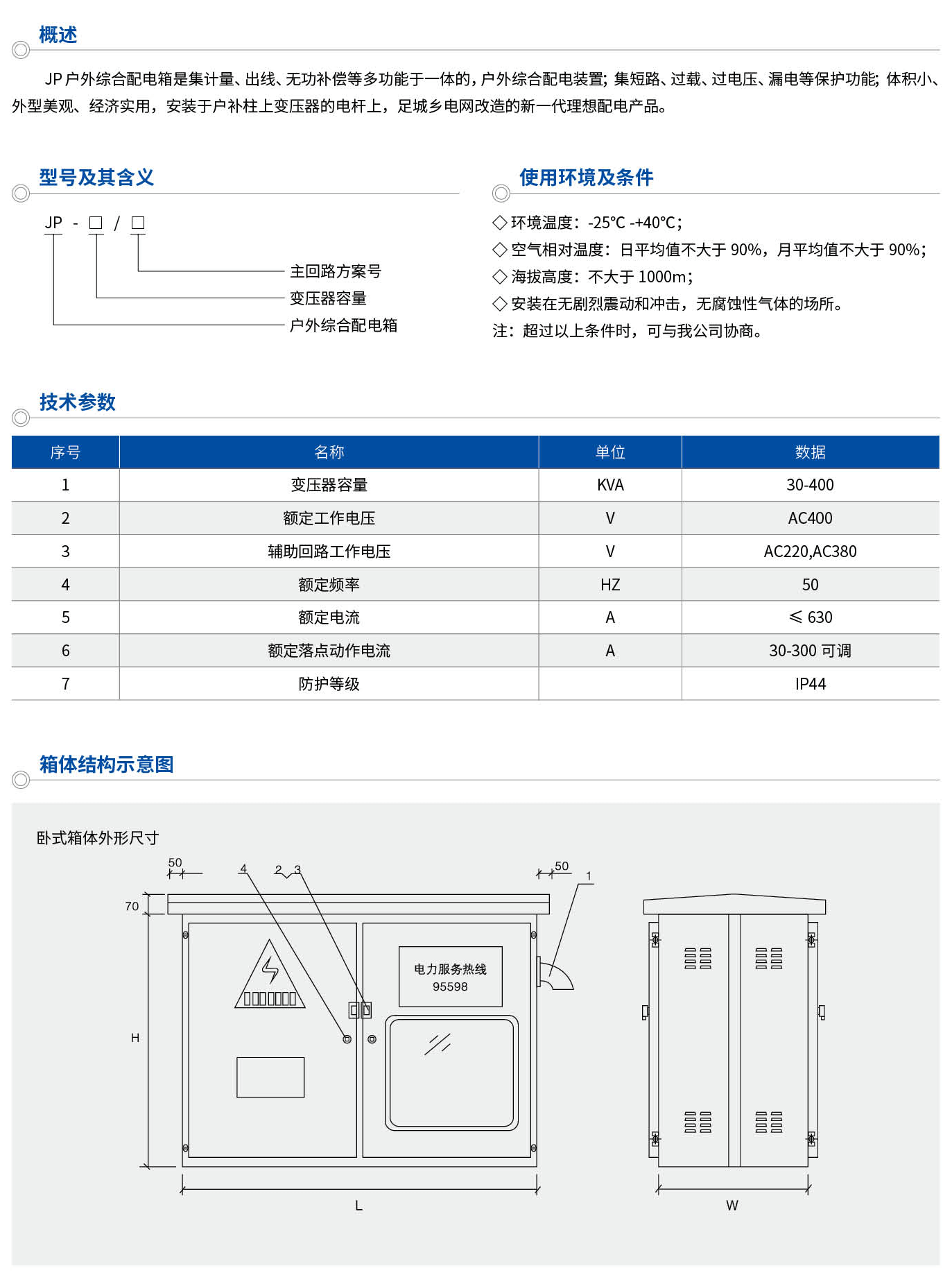 JP户外综合配电箱是集计量、出线、无功补偿等多功能于一体的,户外综合配电装置;集短路、过载、过电压、漏电等保护功能;体积小、外型美观、经济实用,安装于户补柱上变压器的电杆上,足城乡电网改造的新一代理想配电产品。